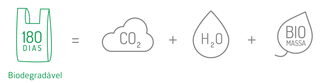 É o material que se biodegrada em até 180 dias. Esse processo ocorre pela ação de microrganismos e depende de condições favoráveis – por exemplo, em usinas de compostagem. Dessa biodegradação, resultam água, CO2 e biomassa.