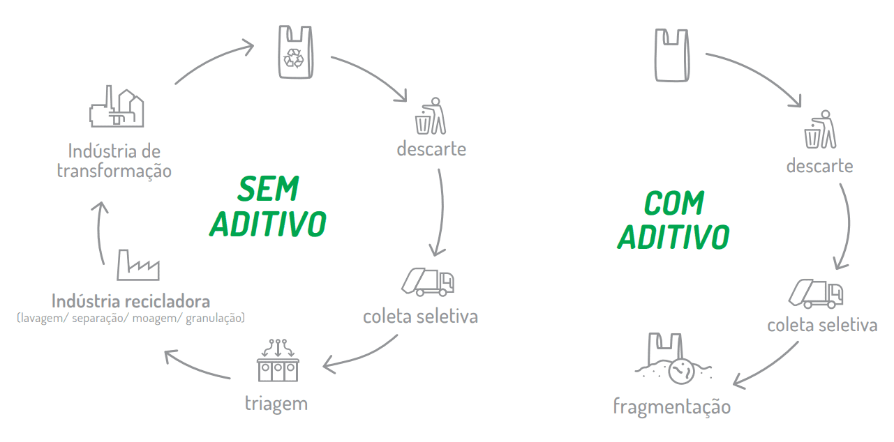 O material plástico é reciclável porém, com o aditivo degradante ele deixa de ser reciclável. As partículas resultantes do seu processo de degradação, podem permanecer por longo período no meio ambiente. Além disso, o aditivo pode deixar rastros de metais pesados.